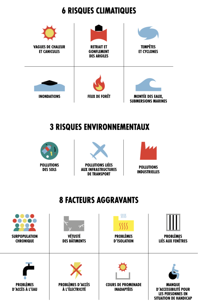 Sur la base de données publiques (Ministère de la Justice, CGLPL, OIP, site Géorisques, Météo France, etc.) nous avons évalué neuf risques climatiques et environnementaux auxquels les prisons sont exposées, ainsi que huit aspects récurrents du système pénitentiaire français actuel que nous avons retenus comme facteurs aggravants, car renforçant la vulnérabilité des personnes face aux conséquences des événements climatiques extrêmes et des pollutions.