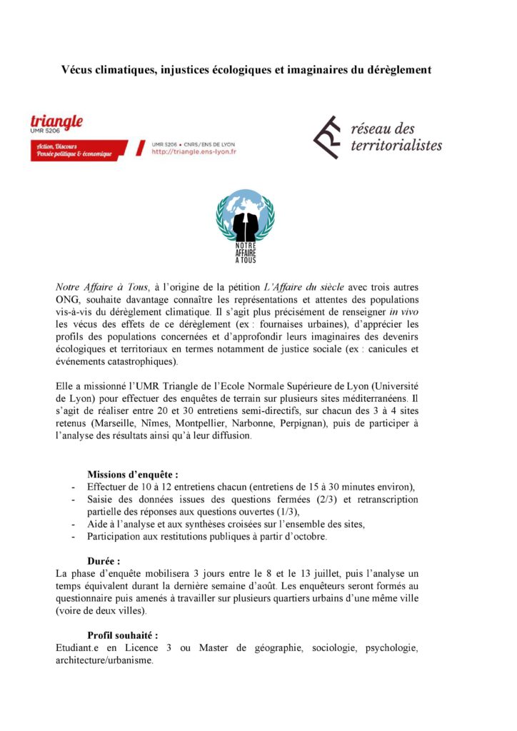 Notre partenariat avec l’Université de Lyon 2 permettra la réalisation d’une enquête qualitative cet été dans le sud de la France sur le ressenti des habitant-es par rapport aux effets des changements climatiques. Ces travaux pourront ensuite faire l’objet d’une publication et d’une restitution lors d’un événement public commun à l’automne. Par la suite nous pourrons peut-être former une coalition des personnes impactées en France et peser pour une réelle justice climatique !