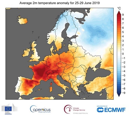 D’après le programme Copernicus  Climate Change Service, « le mois de juin a été le plus chaud jamais enregistré en Europe avec des températures moyennes supérieures de plus de 2°C aux normales », le 27 juin étant la journée la plus chaude enregistrée pour un mois de juin en France.