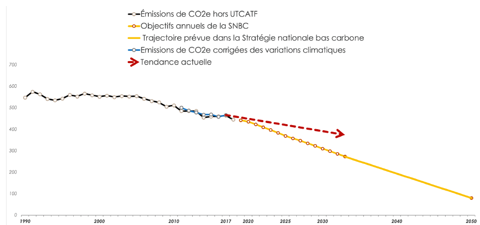 Atteindre la neutralité carbone est l’objectif que la France s’est fixée pour 2050 dans la loi énergie-climat de 2019, conformément à l’Accord de Paris. La feuille de route climatique à long terme de la France, appelée « Stratégie nationale bas carbone », précise qu’en 2050, les émissions de gaz à effet de serre ne pourront pas dépasser 79 MtCO2e par an. C’est à ce niveau que se situeront, selon l’État, les capacités maximales d’absorption du CO2 par notre biosphère (forêts, prairies, océans). Si l’on continue à ce rythme, la France n’atteindra pas la neutralité carbone en 2050 mais… en 2085.
