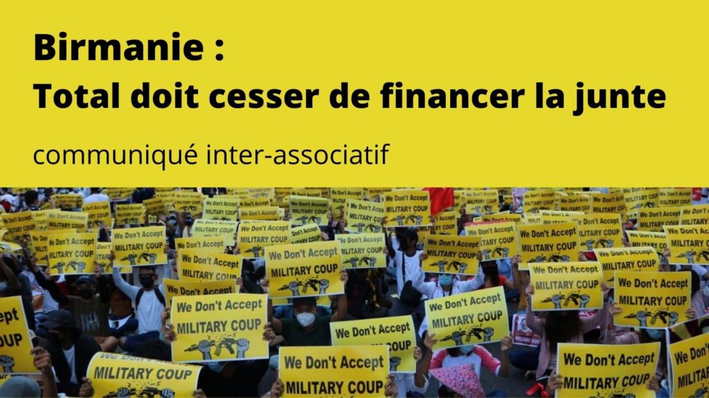 Depuis le coup d’état en Birmanie du 1er février dernier, Total est redevenu l’un des plus importants contributeurs financiers de la junte militaire, qui a repris les pleins pouvoirs par la force et réprime le mouvement de protestation de la population dans le sang. Plus de 200 morts, des centaines de blessés et plus de 2 000 personnes interpellées. Meurtres, torture, persécutions, exécutions extra-judiciaires, arrestations arbitraires… : le Rapporteur spécial de l’Onu sur la Birmanie évoque de probables crimes contre l’Humanité.