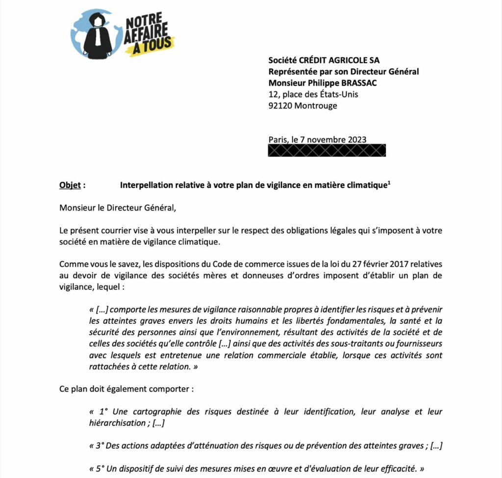 Les courriers d’interpellation à la Société Générale, Crédit Agricole, Carrefour ou encore Stellantis-PSA, visent à apporter un éclairage sur les défaillances de leurs plans de vigilance et les mesures à prendre urgemment afin de se mettre en conformité avec la loi, qu’il s’agisse d’une meilleure identification des risques que leurs activités font peser sur le climat, d’une reconnaissance plus claire de leur responsabilité individuelle à agir ou encore de mesures concrètes de vigilance adaptées à la hauteur et à la temporalité des enjeux humains et environnementaux que soulèvent la crise climatique.