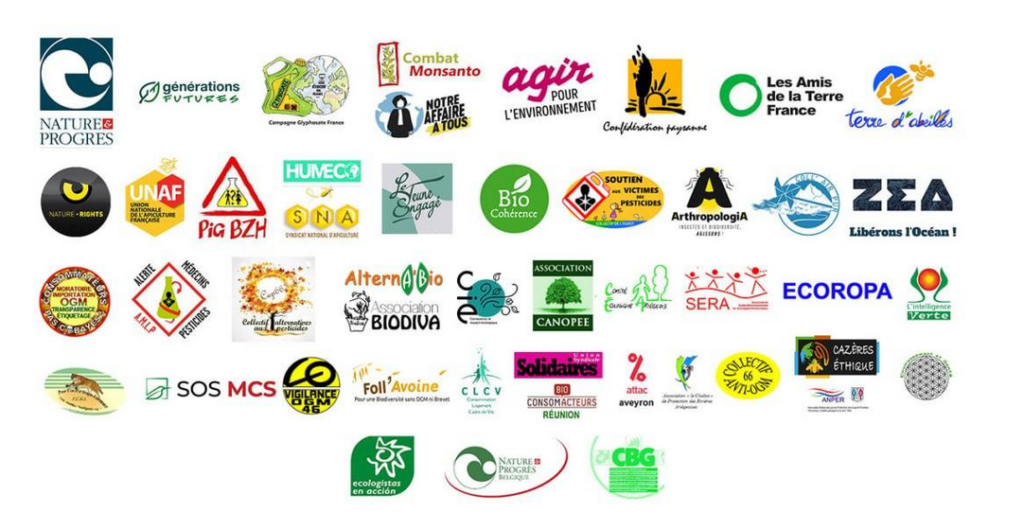 Agir Pour l’Environnement, Association Nationale pour la Protection des Eaux et Rivières, Alterna’bio, Arthropologia, Campagne glyphosate France, Collectif Alternatives aux Pesticides 66, Collectif anti-OGM 66, Comité Écologique Ariègeois, Confédération paysanne nationale (et ses groupes locaux Aveyron, Lot et Ariège), Environnement et Santé, Foll’avoine, Générations Futures, Halte OGM 07, Le Chabot, Nature & Progrès France (et ses groupes locaux Ardèche, Aveyron et Tarn), Nature Rights, Notre Affaire à Tous, PIG BZH, Santé Environnement Auvergne/Rhône-Alpes, Secrets Toxiques, SOS MCS, Syndicat National d’Apiculture, Terre d’abeilles, Union Nationale de l’Apiculture Française