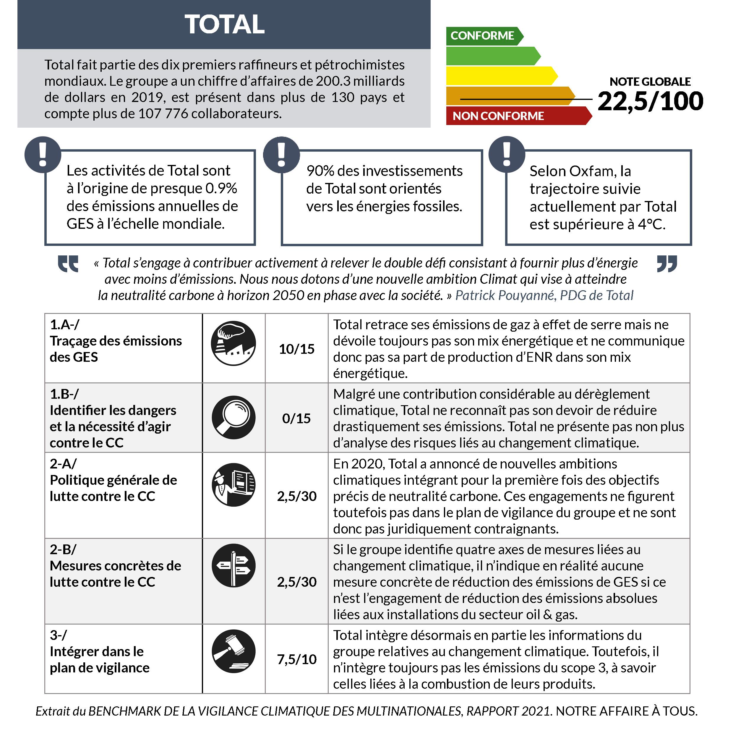 Ces fiches entreprises sont issues de notre benchmark 2021 de la vigilance climatique des multinationales. Elles sont classées par ordre de la moins bonne note à la meilleure note de notre classement. Le podium des mauvais élèves est composé de Total, Natixis et Casino.