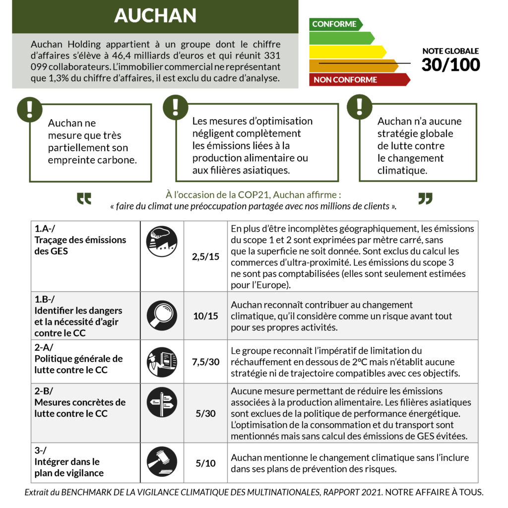 Auchan ne mesure toujours pas son empreinte carbone. Si Auchan reconnaît sa contribution au changement climatique, le groupe n’a aucune stratégie climatique. Les mesures de réduction des émissions sont parcellaires et ne s’inscrivent pas dans une trajectoire précise et chiffrée.