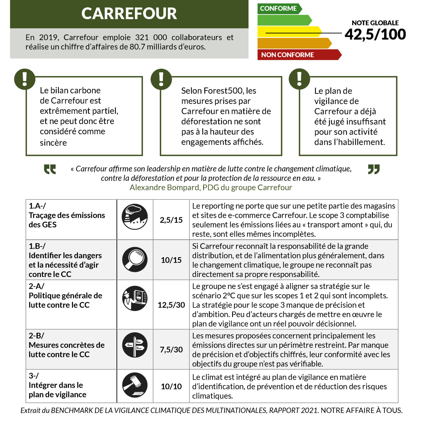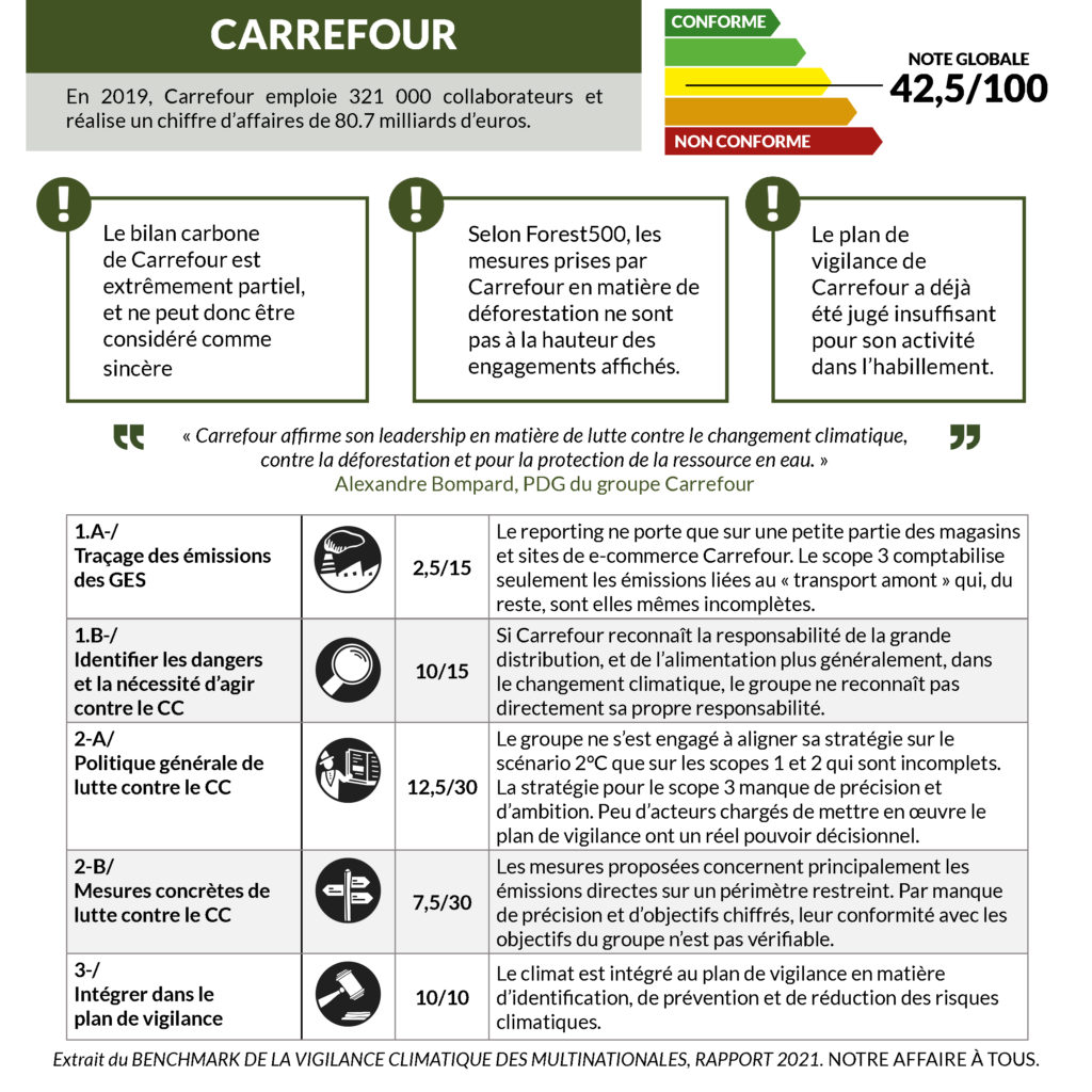 Carrefour ne chiffre toujours pas son empreinte carbone. Si Carrefour a conscience des conséquences du changement climatique, le groupe n’identifie pas correctement ses émissions de gaz à effet de serre, ne dispose pas d’une stratégie ambitieuse et ne prend pas de mesures adéquates.