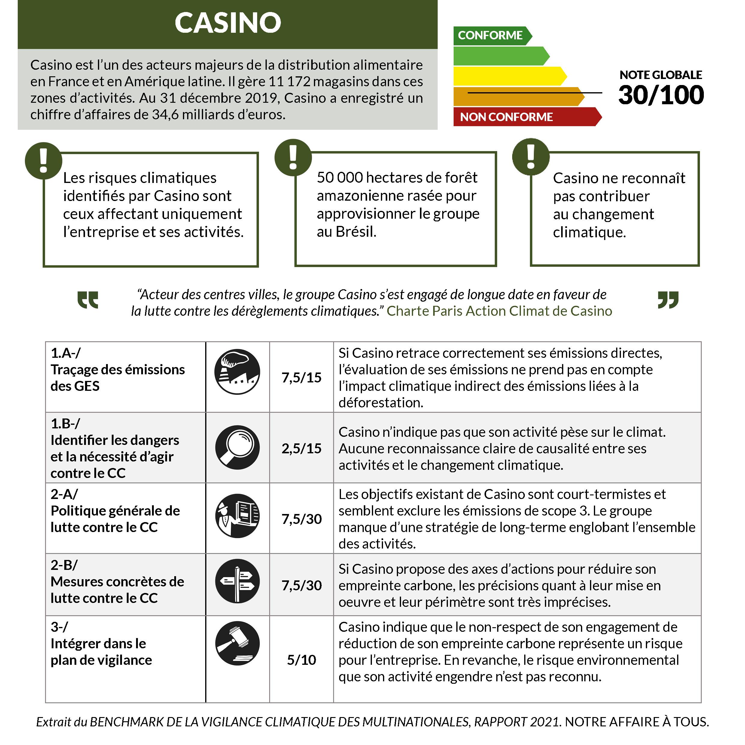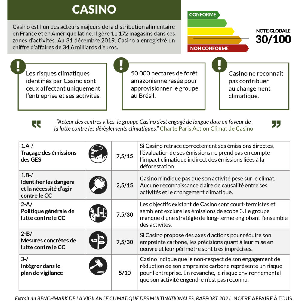 Casino complète le podium des plus mauvais élèves de notre rapport sur la vigilance climatique.