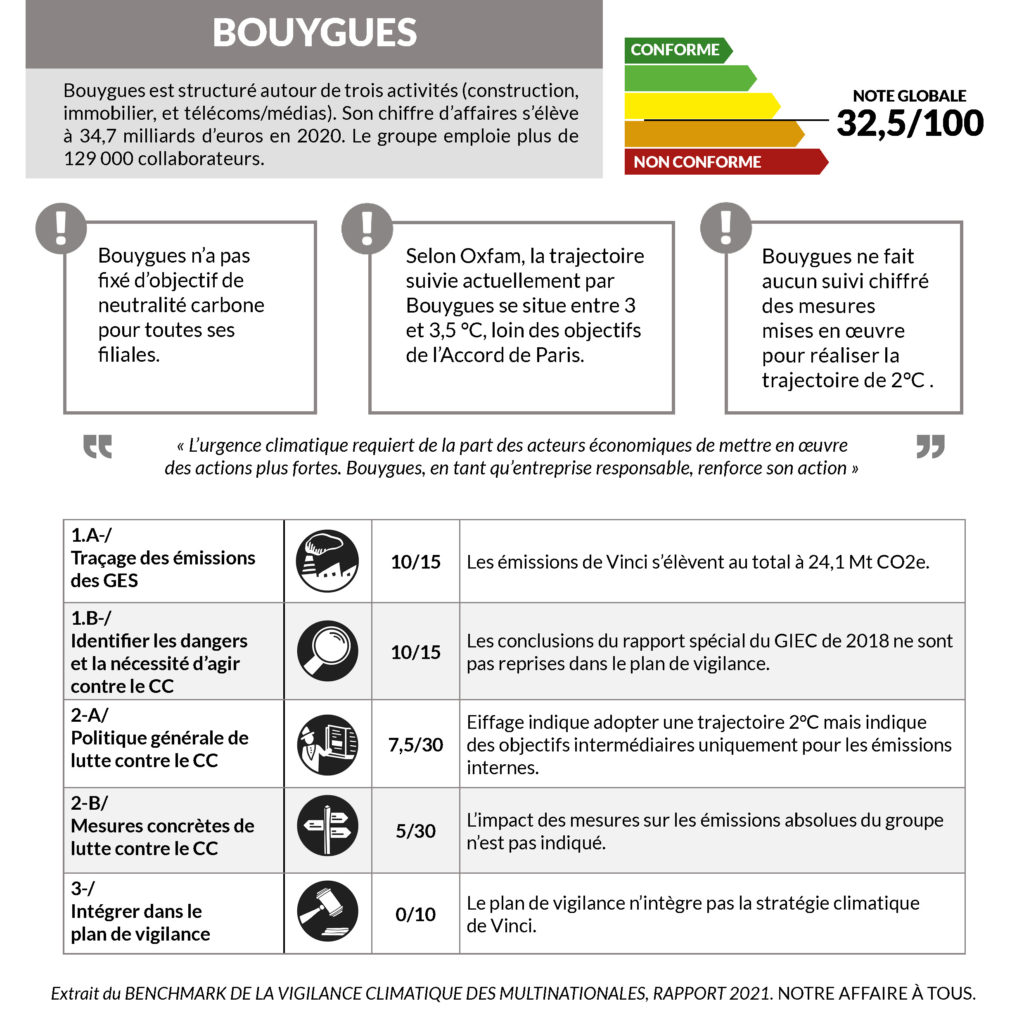 Bouygues et dans le classement des cinq plus mauvais élèves de notre benchmark de la vigilance climatique des multinationales et obtient une note de 32,5/100.