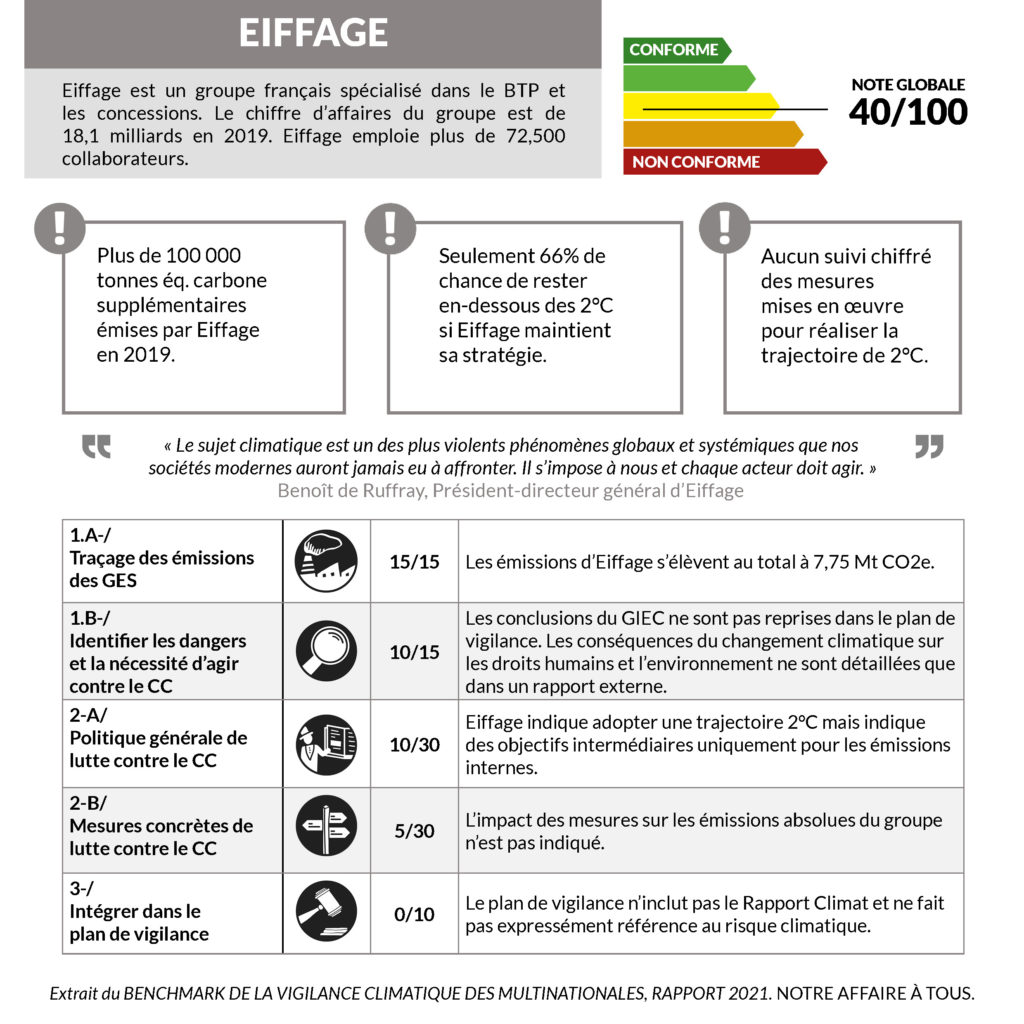Eiffage se classe à la huitième place de notre classement sur la vigilance climatique des multinationales françaises.
