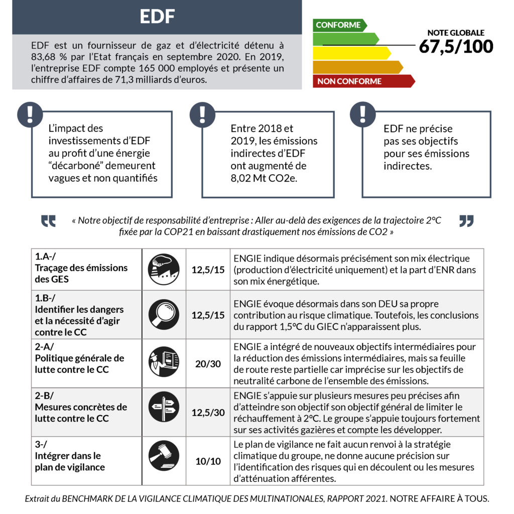 Le modèle d’EDF reste peu carbonée du fait de ses activités dans le nucléaire et le groupe affiche une stratégie climatique ambitieuse. Cependant, la plupart des mesures annoncées restent non chiffrées et ne permettent pas de vérifier leur compatibilité avec la trajectoire 1,5°C annoncée par le groupe.