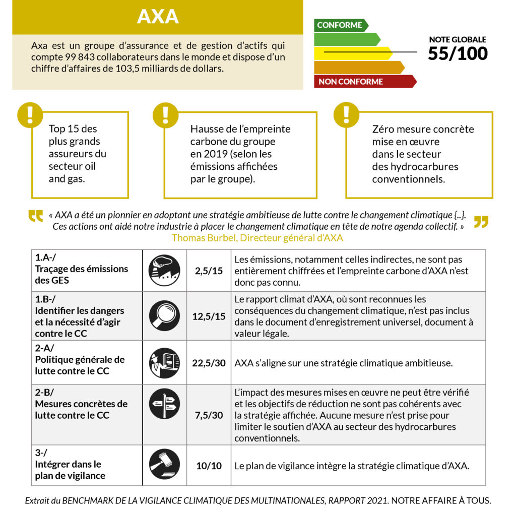 Axa ne communique pas la totalité de son empreinte carbone. Malgré un changement de stratégie globale et un alignement sur une trajectoire 1,5°C, Axa ne propose pas de mesures vérifiables et cohérentes avec la stratégie affichée.