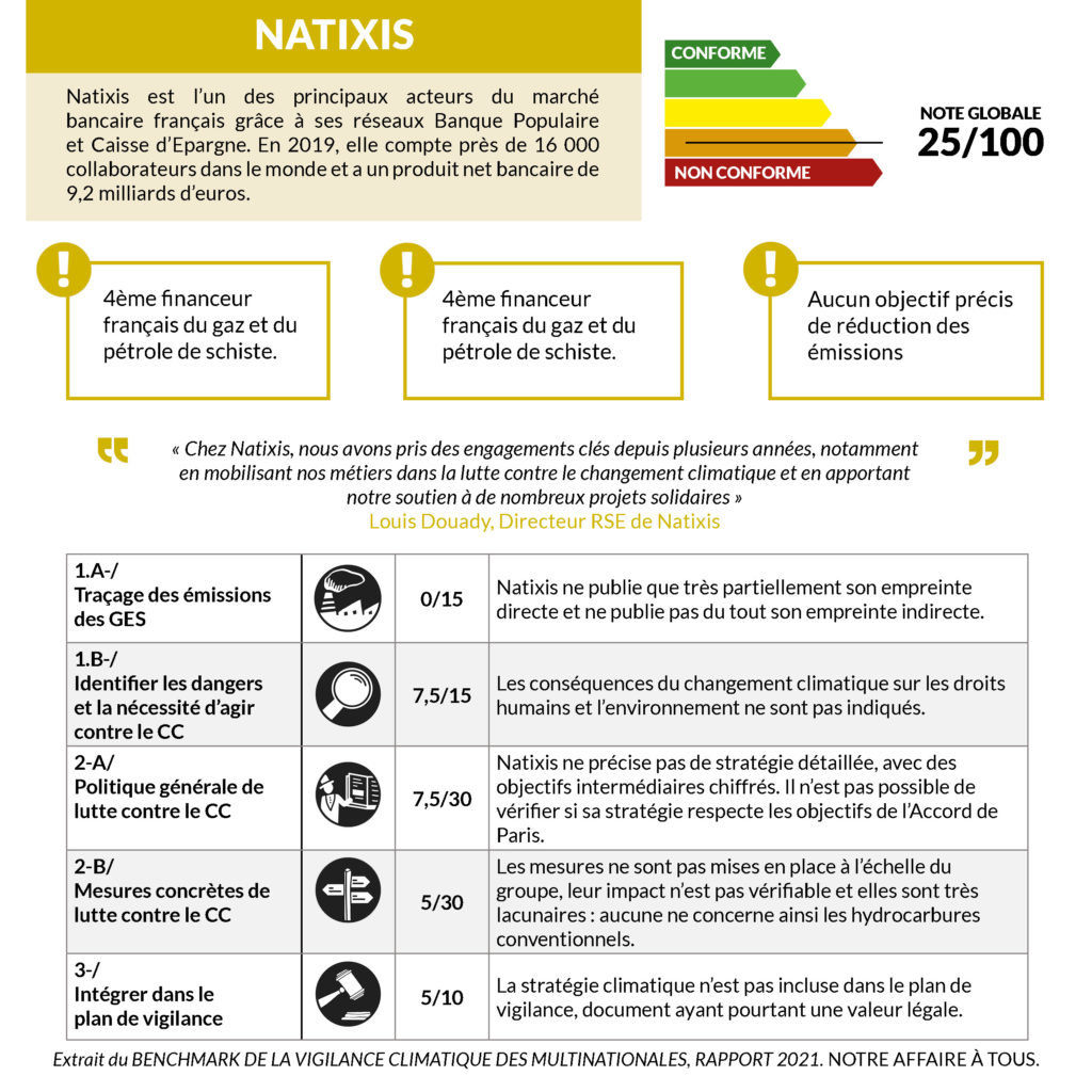 Natixis est la deuxième plus mauvaise élève du classement de notre benchmark sur la vigilance climatique des multinationales.