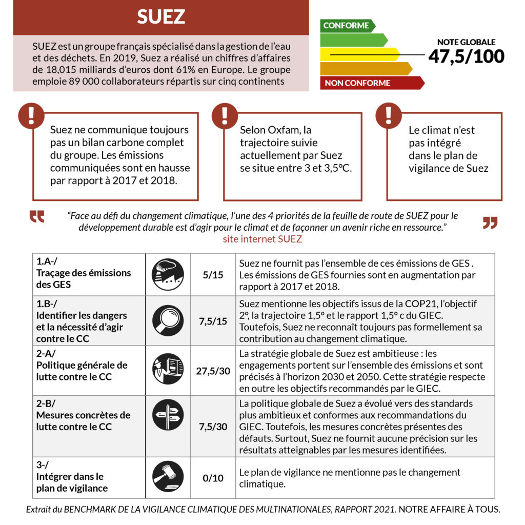 Le plan de vigilance de Suez n’intègre toujours pas le changement climatique. Si Suez a une stratégie ambitieuse, le groupe ne communique pas un son bilan carbone complet, les mesures ne sont pas chiffrées et leur impact n’est pas démontré.