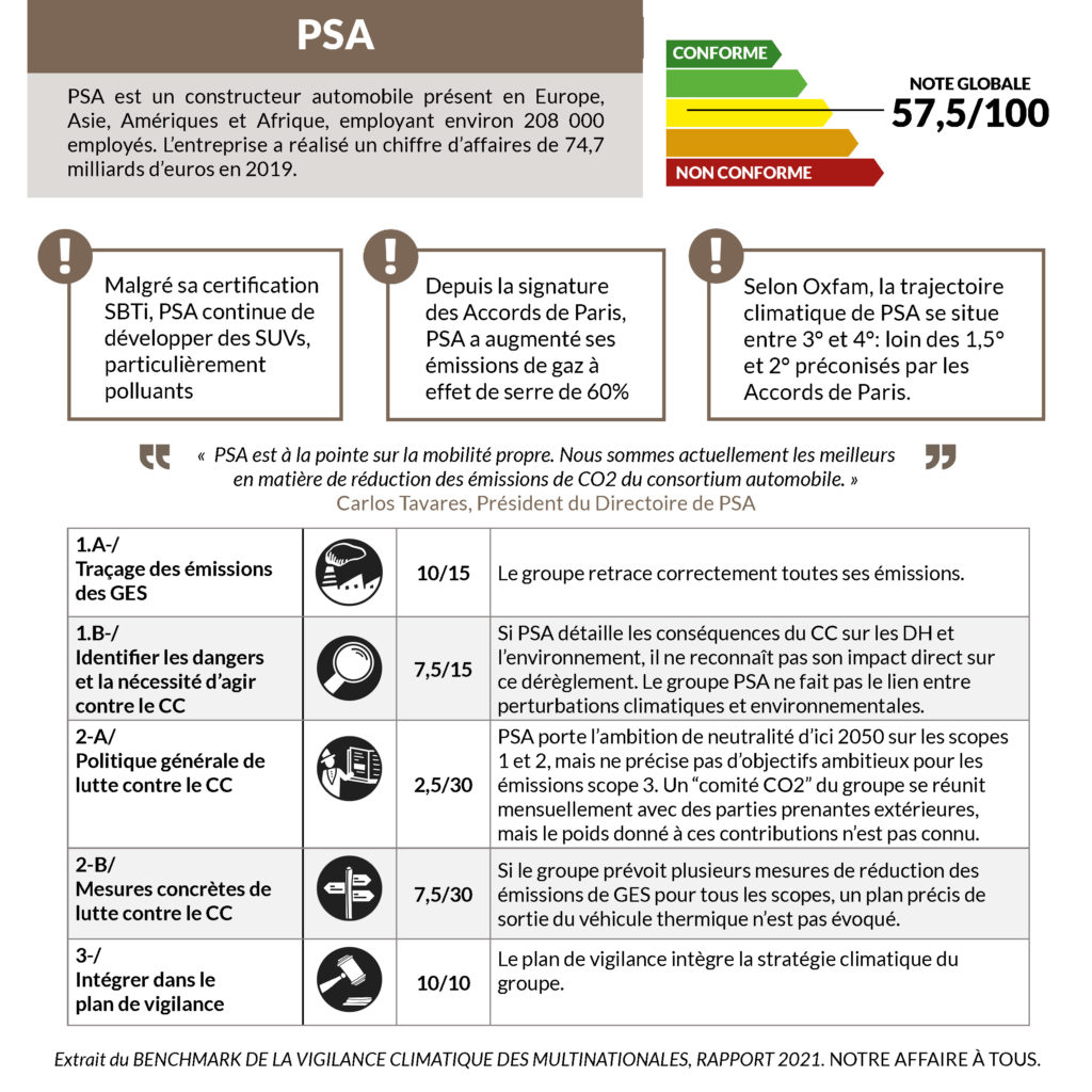 PSA chiffre la totalité de ses émissions de GES et analyse correctement les conséquences du changement climatique. Il faut toutefois qu’il reconnaisse explicitement sa responsabilité, adopte une stratégie plus ambitieuse et détaille davantage l’impact des mesures mises en œuvre.