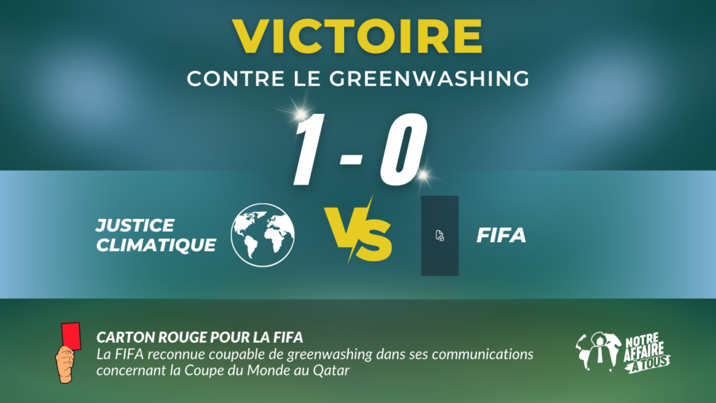 Paris, 7 juin 2023 – Carton rouge pour la FIFA. Notre Affaire A Tous et 5 autres organisations européennes viennent de faire reconnaître le greenwashing de la FIFA devant la Commission Suisse pour la Loyauté, organisme chargé du contrôle de la publicité en Suisse. Cette décision fait suite à plusieurs plaintes déposées en novembre 2022 simultanément auprès de certaines autorités européennes de régulation de la publicité (Suisse, France, Royaume-Uni, Belgique et Pays-Bas), ciblant les allégations de neutralité carbone entourant la coupe du monde 2022 au Qatar.