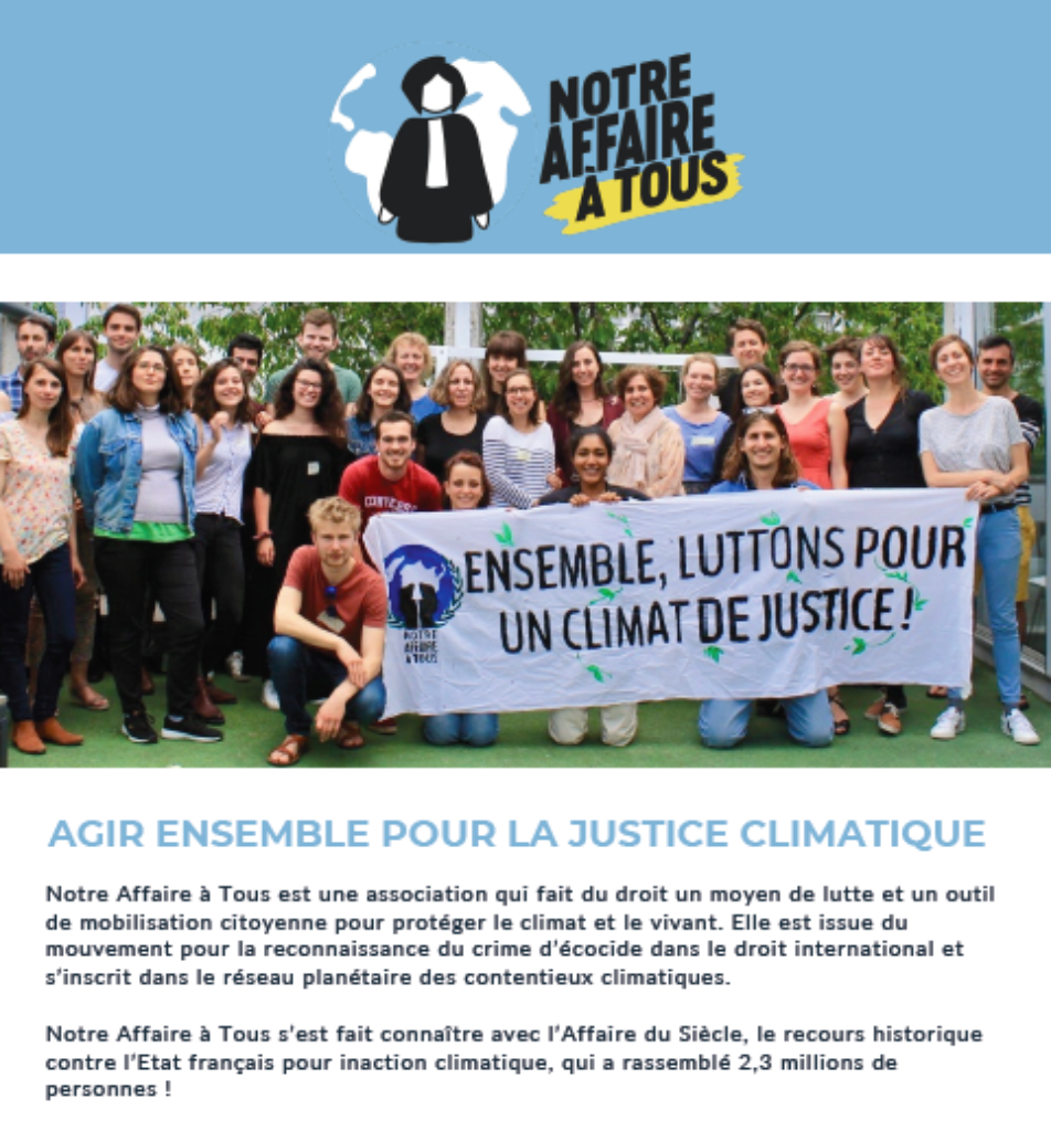 Notre Affaire à Tous est une association qui fait du droit un moyen de lutte et un outil de mobilisation citoyenne pour protéger le climat et le vivant. Elle est issue du mouvement pour la reconnaissance du crime d’écocide dans le droit international et s’inscrit dans le réseau planétaire des contentieux climatiques.
