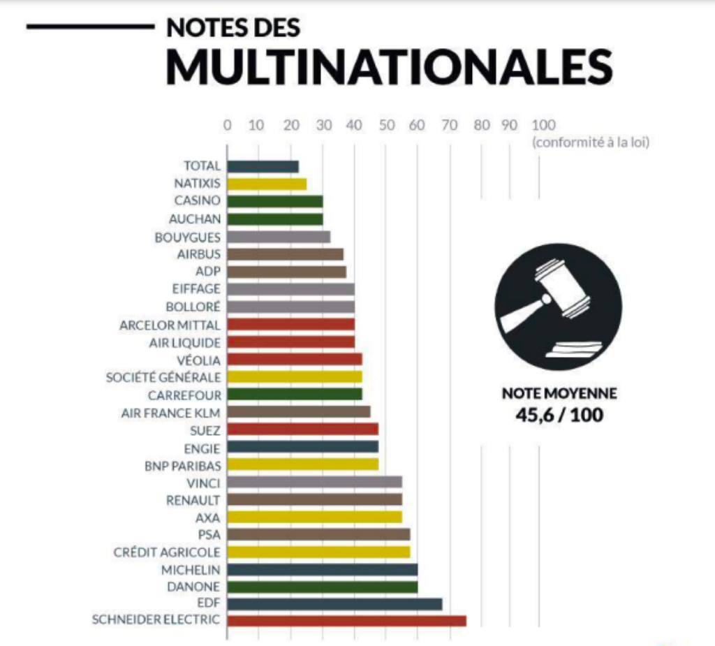 Toutes les entreprises du benchmark s’exposent par conséquent à un risque juridique : la loi permet à toute personne ayant un intérêt à agir de demander au juge d’enjoindre l’entreprise à publier et mettre en œuvre un plan de vigilance conforme aux obligations légales.