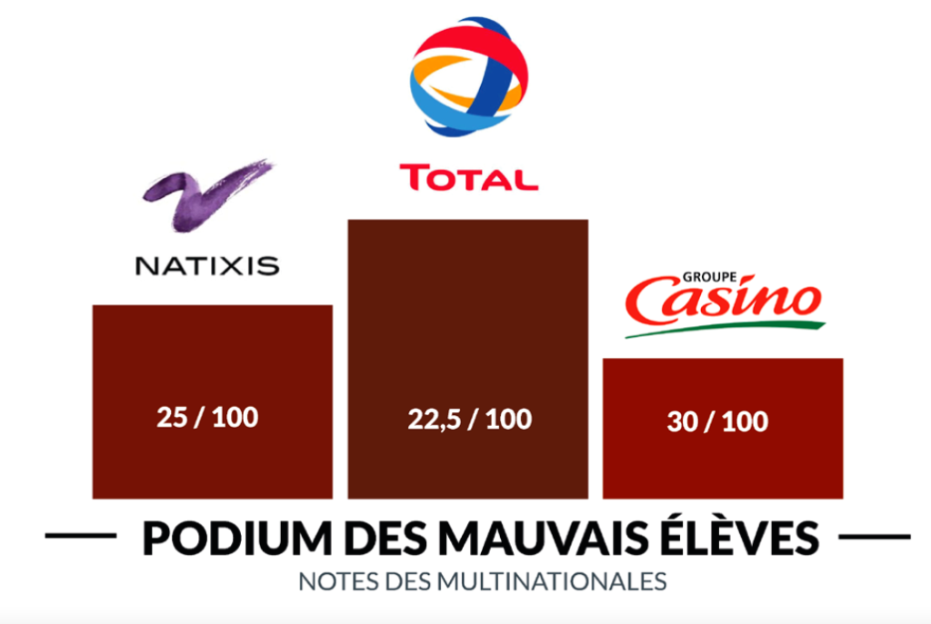 Total, Natixis, Casino, Auchan et Bouygues se situent tout en bas de notre classement en raison de politiques climatiques particulièrement insuffisantes.