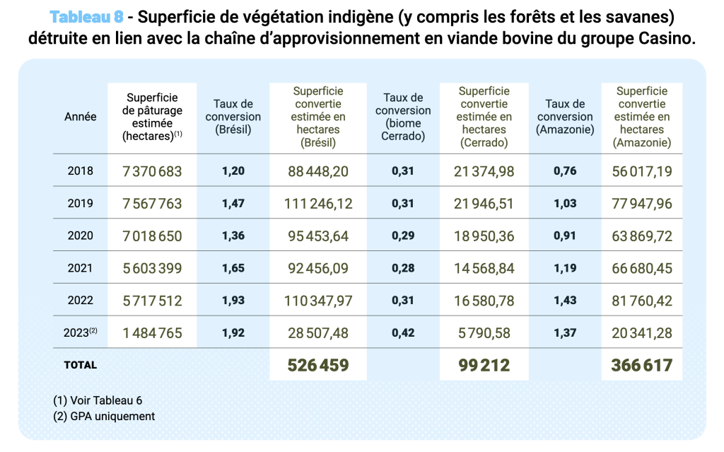 Les estimations des destructions d’écosystèmes – forêts, savanes et autres types de végétation – résultant des approvisionnements en viande bovine du groupe Casino entre 2018 et 2023 sont résumées dans le tableau ci-dessous. Il distingue ces destructions selon différents biomes, et est disponible en page 28 du rapport réalisé par l’Instituto Centro de Vida.